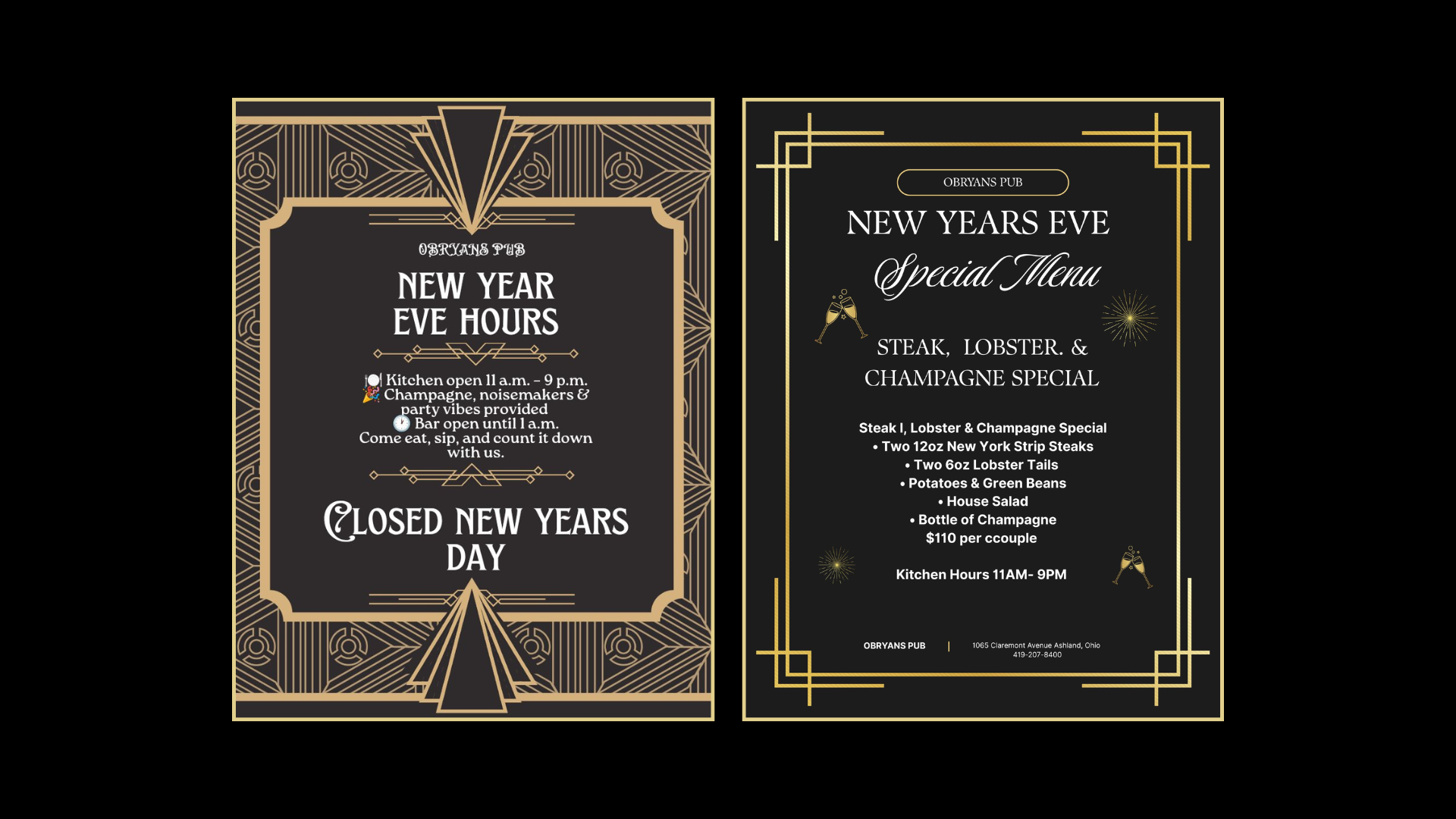 New Year's Eve dinner, pre-order required. Kitchen open 11am-9pm, bar closes at 1am. Champaign, noisemakers, and the OSU Football Playoff Game. O'Bryan's