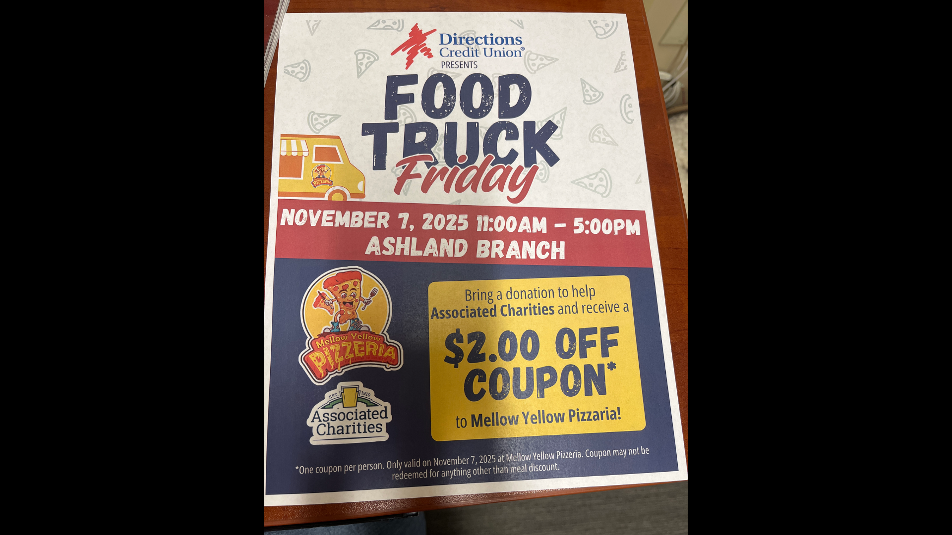 Bring in a food donation to help Associated Charities and get $2 off the Mellow Yellow Pizzeria food truck.