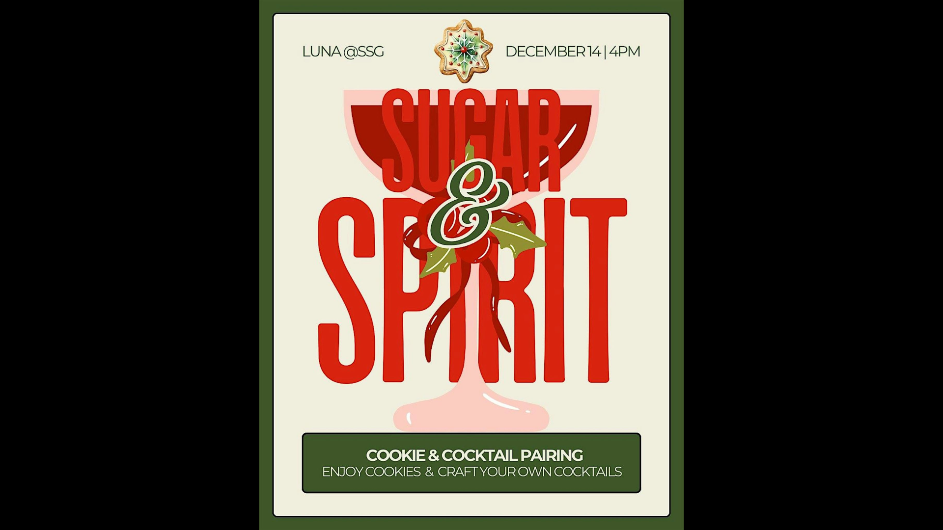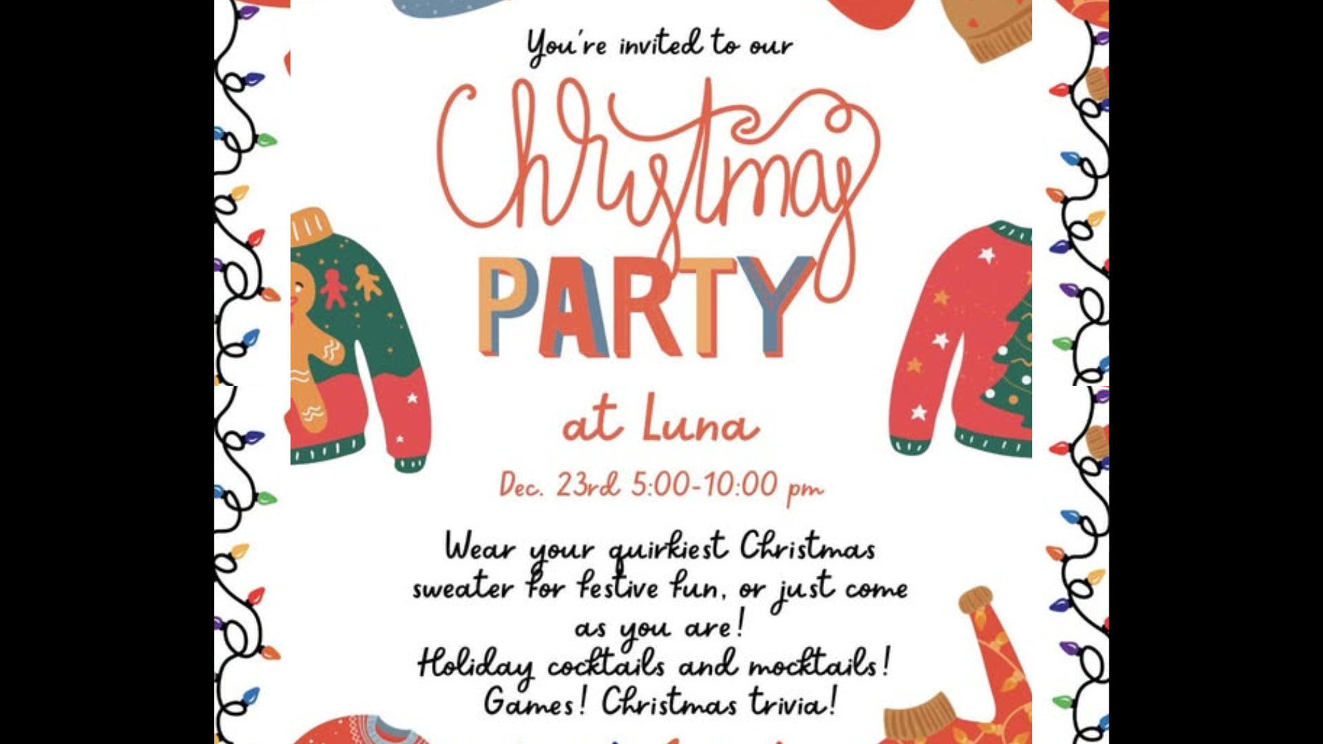 Christmas Party at Luna. Tuesday the 23rd. Wear your quirkiest Christmas sweater for festive fun or come as you are. Holiday cocktails and mocktails, games, and Christmas trivia! Luna at SSG