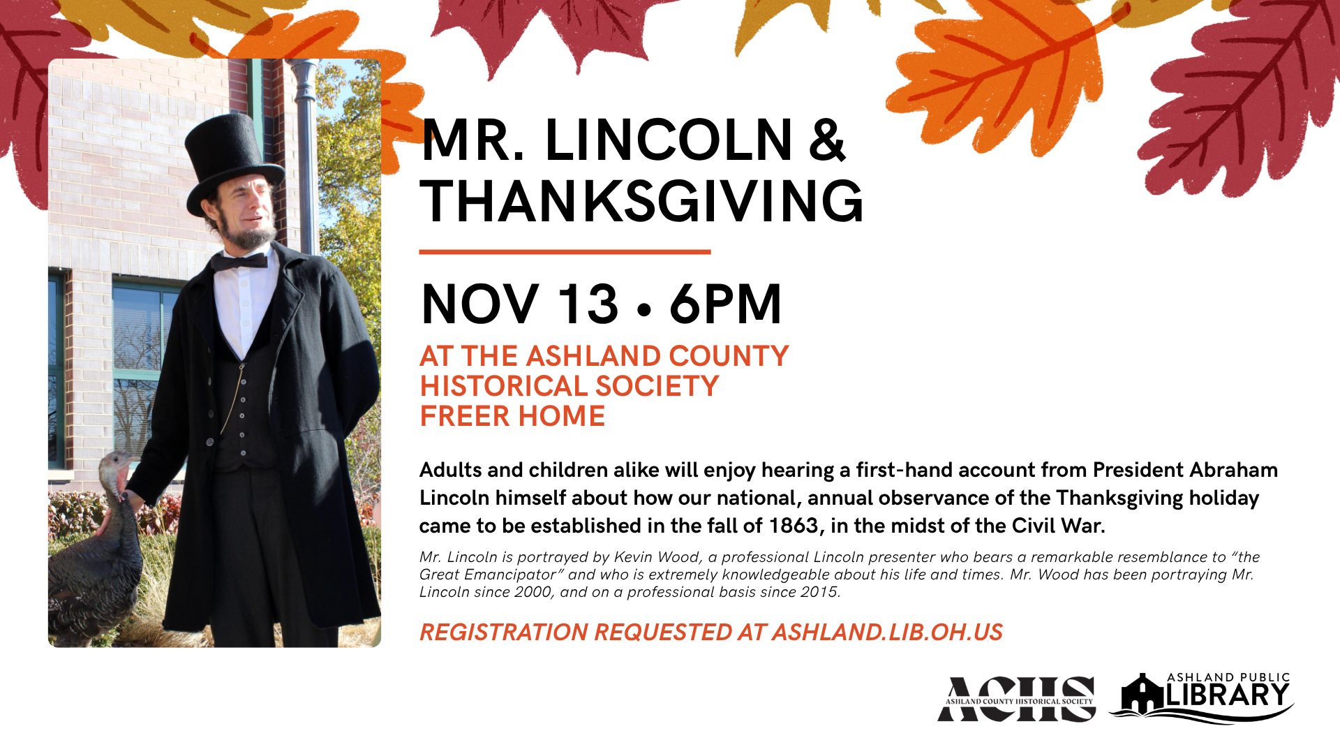 Nov 13 7:00 pm - 9:00 pm Mr. Lincoln & Thanksgiving Freer Home 1260 Center St, Ashland Event Details Get Directions