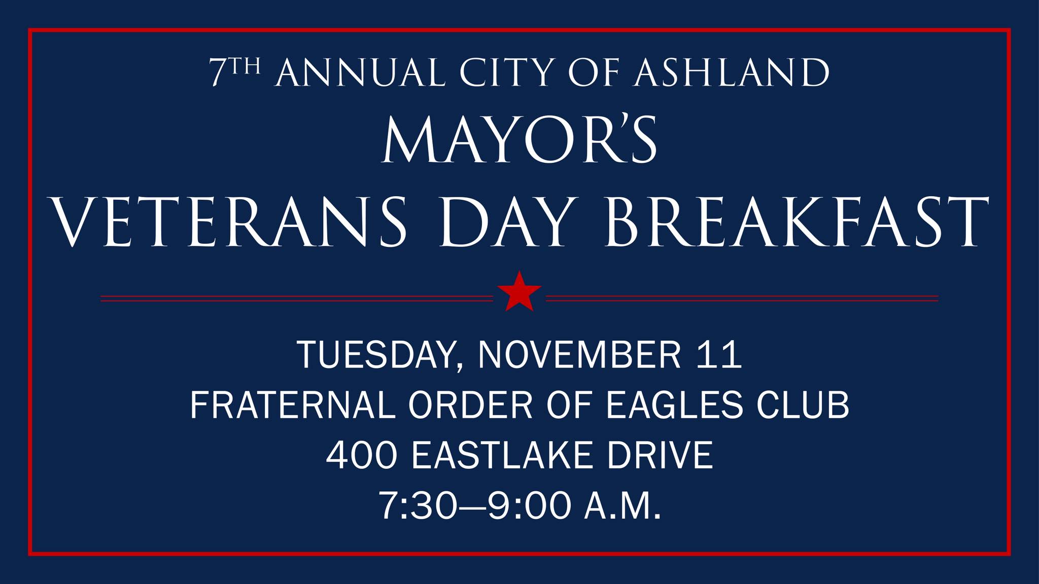Nov 11 7:30 am - 9:00 am Mayor’s Veterans Day Breakfast Ashland Eagles Club 400 Eastlake Drive, Ashland Event Details Get Directions