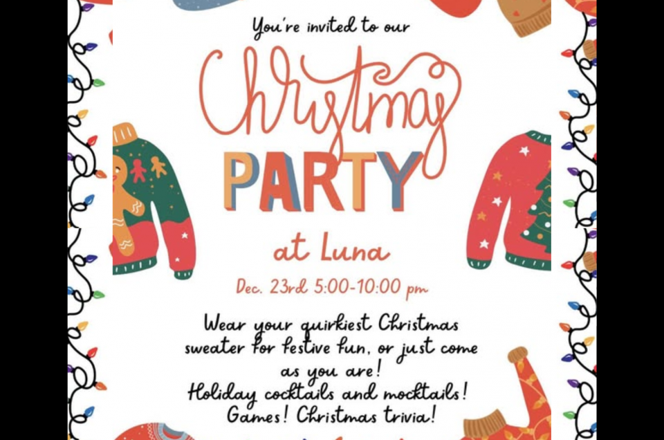 Christmas Party at Luna. Tuesday the 23rd. Wear your quirkiest Christmas sweater for festive fun or come as you are. Holiday cocktails and mocktails, games, and Christmas trivia! Luna at SSG